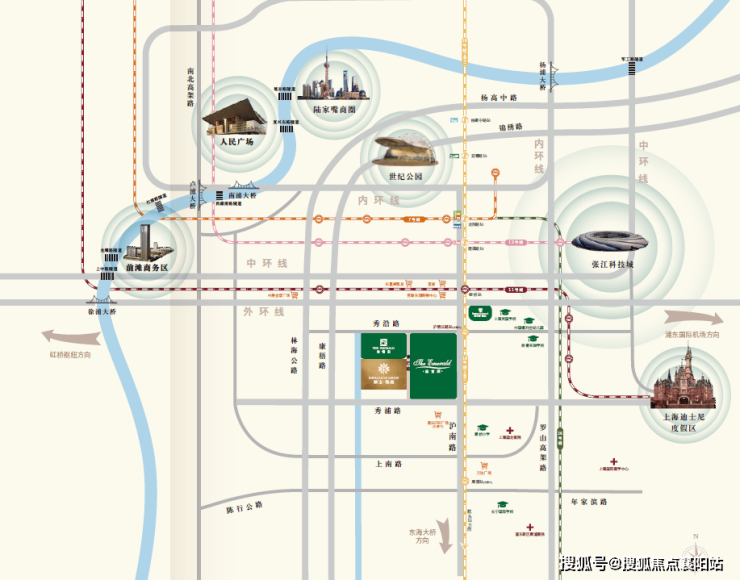 并且凭借区域内的中环线、S20 、11 号线等道路交通设施。把康桥和前滩、张江科学城、迪土尼、浦东国际空港、外高桥自由贸易区等五大引擎连成一条黄金轴线。