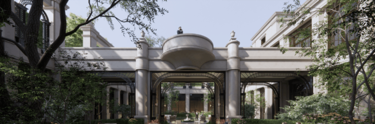 超大私家庭院 :入户庭院面积阔绰,营造 “ 结庐在人境,而无车马喧 ” 的私密院落生活。