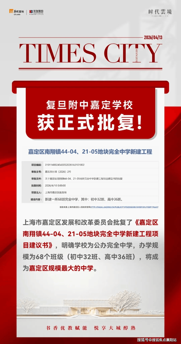 与项目一路之隔的复旦附中嘉定学校,预计2026年年内开建。近日,上海市嘉定区发展和改革委员会批复了《嘉定区南翔镇44-04、21-05地块完全中学新建工程项目建议书》,明确复旦附中嘉定学校为公办完全中学,办学规模为68个班级(初中32班、高中36班),将成为嘉定区规模最大的中学,赋能区域全龄教育矩阵。(信息来源:上海发展指南)