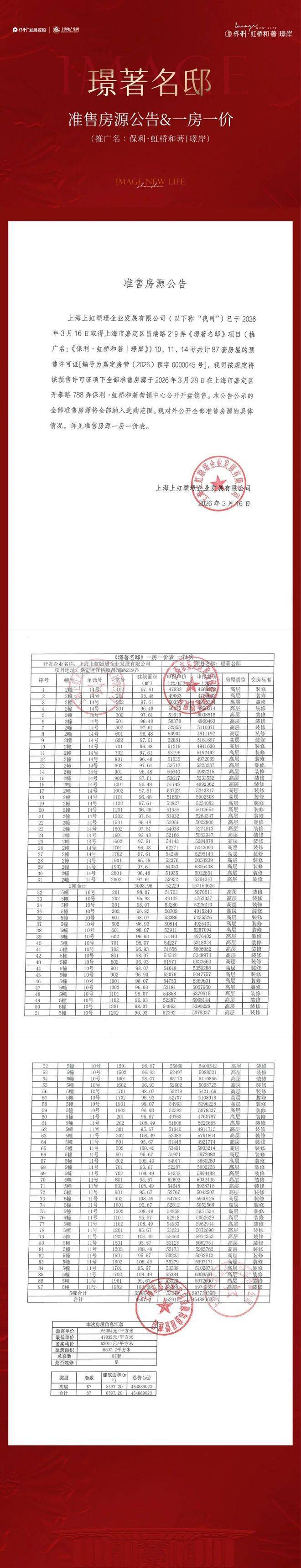 保利虹桥和著璟岸首批次取证,本次推出建筑面积约95-108㎡三房户型,共计87套房源,备案均价52911元/㎡,总价约460万元起。项目于3月 18日正式启动认购。(一房一价表在文章后面)