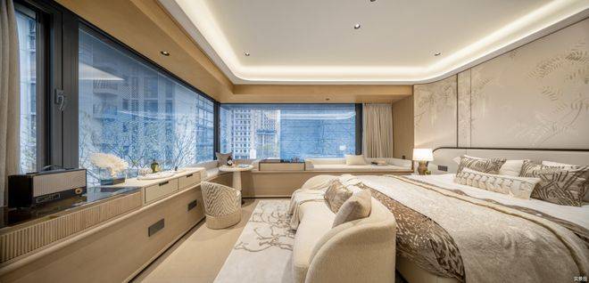 主卧拥有270度环幕飘窗,视野和采光优越,配备了高奢卫生间,空间感、尊崇感拉到顶格。