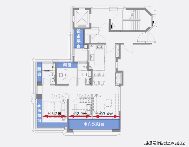 南向双阳台、卧室飘窗、设备平台全部被有效整合,不是简单赠送,而是可以真正转化为生活空间。