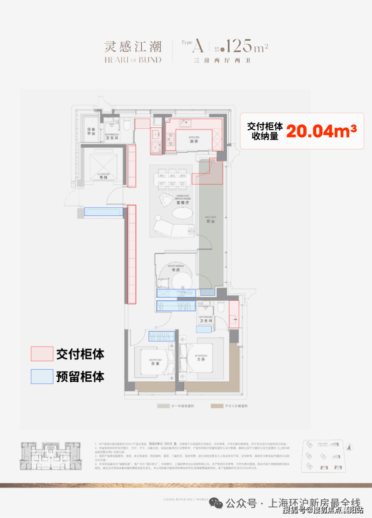 据小胖君手工统计,项目125㎡3房边套户型的整体交付柜子+预留衣柜, 收纳空间可以达到约20.04m³,中间套户型也能达到约16.56m³!