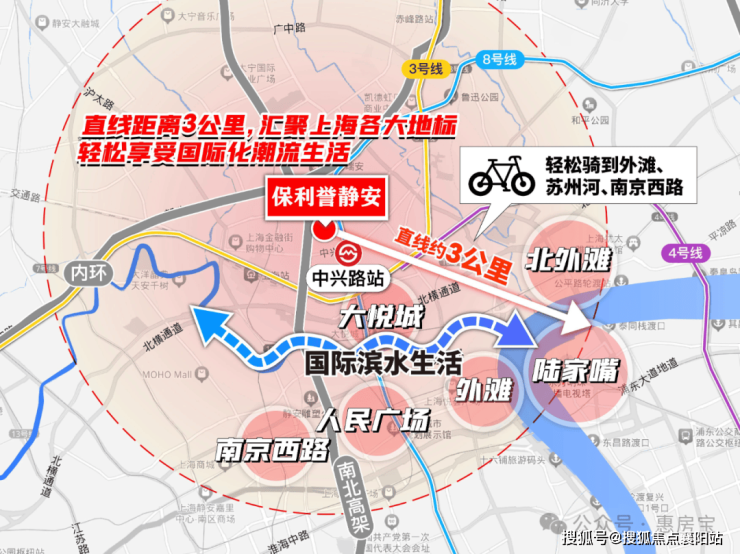 反过来看,外滩、陆家嘴、人广、北外滩、南京路等CBD,同样在项目3公里生活半径内。住在这样的地方,无疑轻松享受国际化潮流生。