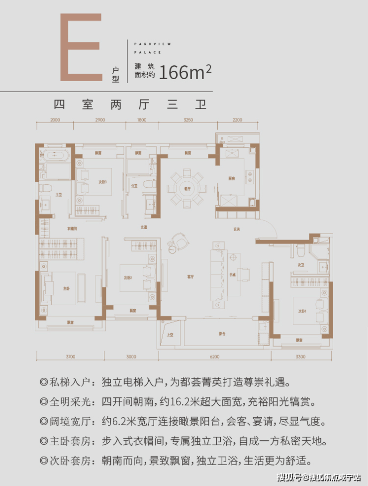 建面约166㎡奢境户型,南向四开间面宽可达约16.2m,约6.2米宽厅连接宽幕阳台,突破性尺度设计,带来通透的全景视野,一眼望向城市自然与繁华,居住于此,大平层的尊崇奢居体验油然而生。