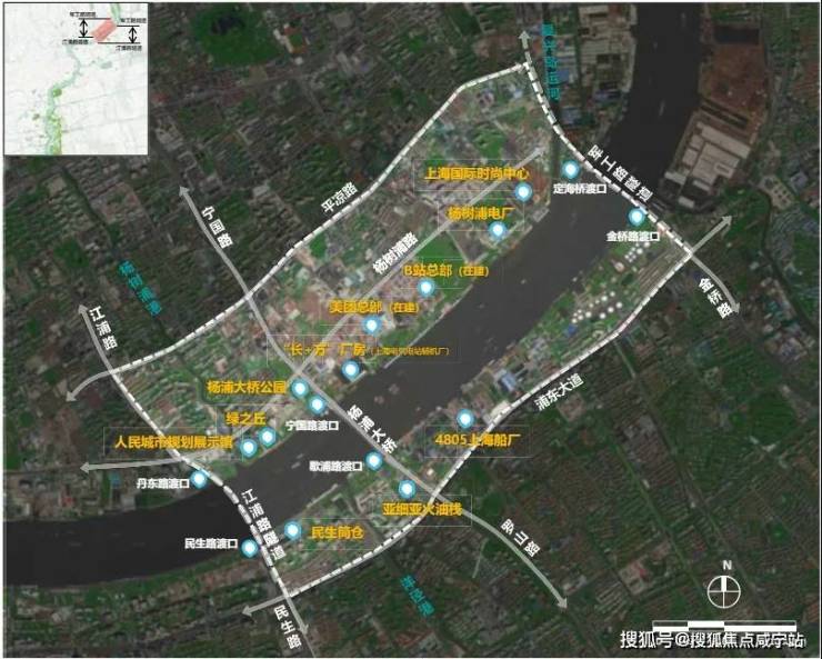 在杨浦滨江版九宫格中,主要是高端住宅+1块风貌商办,而紧邻九宫格的四至方位可以看到: