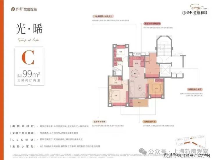 建面约99㎡3房2卫户型不仅保留三开间朝南和餐客厅一体化的优势,更在尺度上大踏步进阶。主卧面宽高达约3.7米,客厅面宽高达约3.75米,适配有尺度改善需求的客户,而市面上同面积段产品尺度基本为客厅面宽约3.5米,主卧约3.3米。