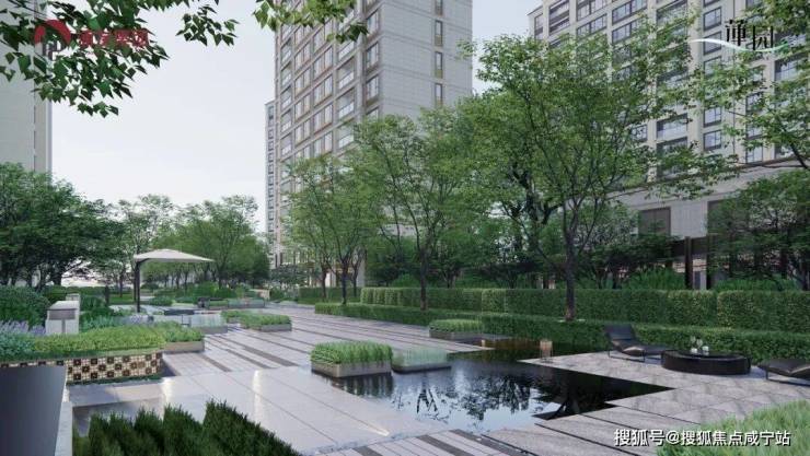 中央水韵庭院以「叠水莲池」为理念打造多层次的水景体系,叠水瀑布形成动态的水流韵律,池畔大理石打造的休憩长桌,成为被绿意环抱的林下空间,氛围相当惬意~
