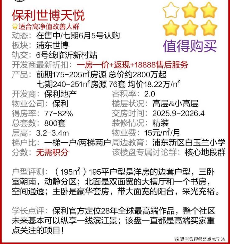 最新消息,浦东一线江景大宅「保利世博天悦」七期6月5号认购!加推建面约240-251㎡房源,均价约18.22万/㎡ !