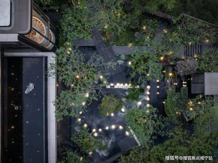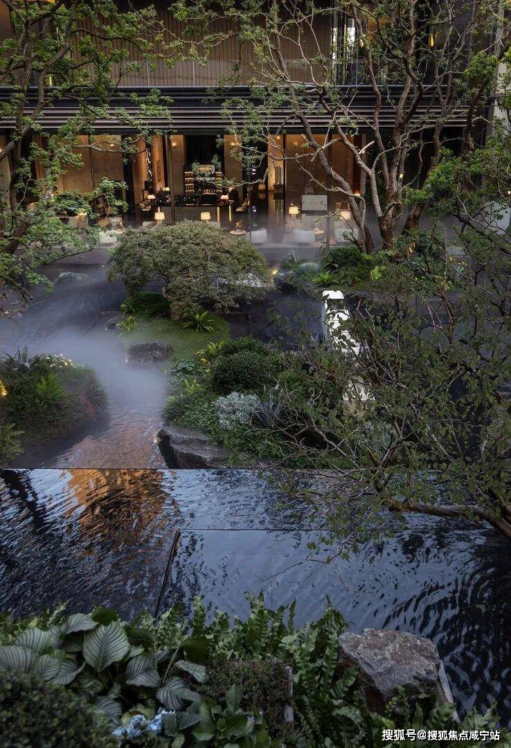 林涧溪谷:以300㎡镜面水为核心,周围环绕叠级景观,水面如镜子般倒映着天空、绿植与石材,分不清哪里是实景,哪里是倒影。