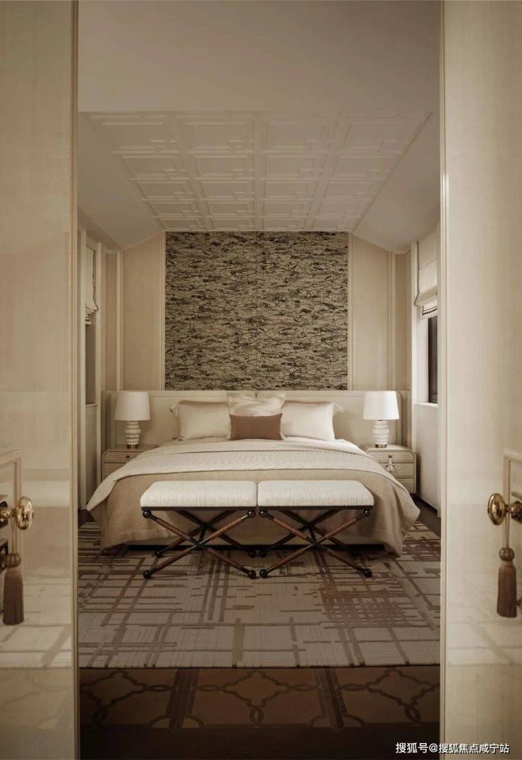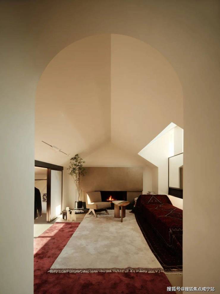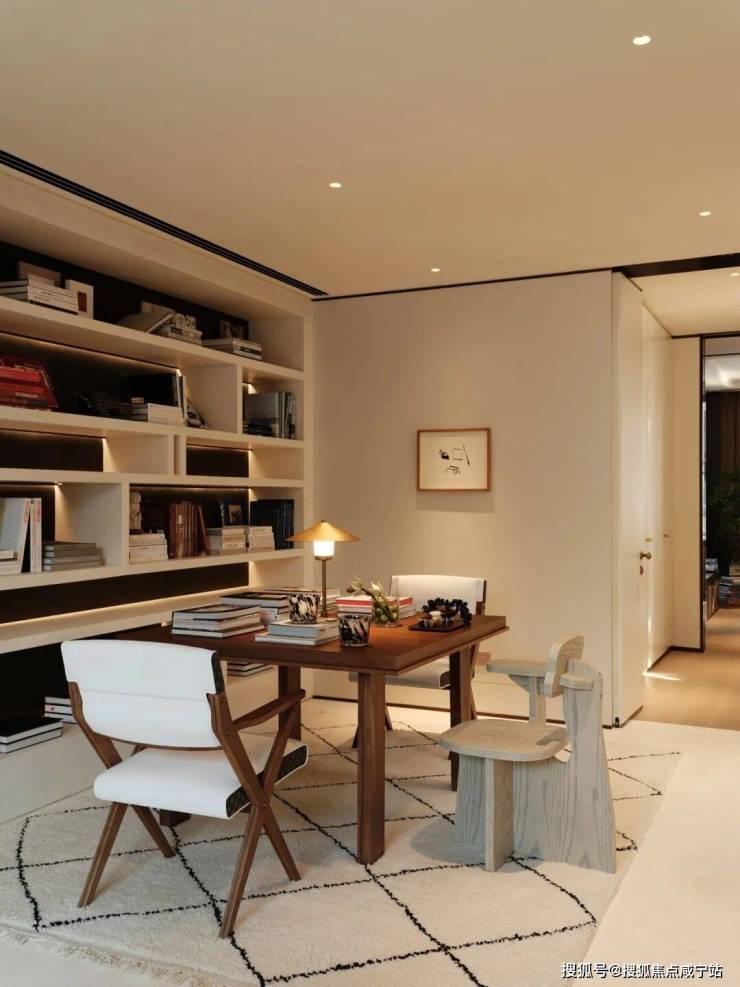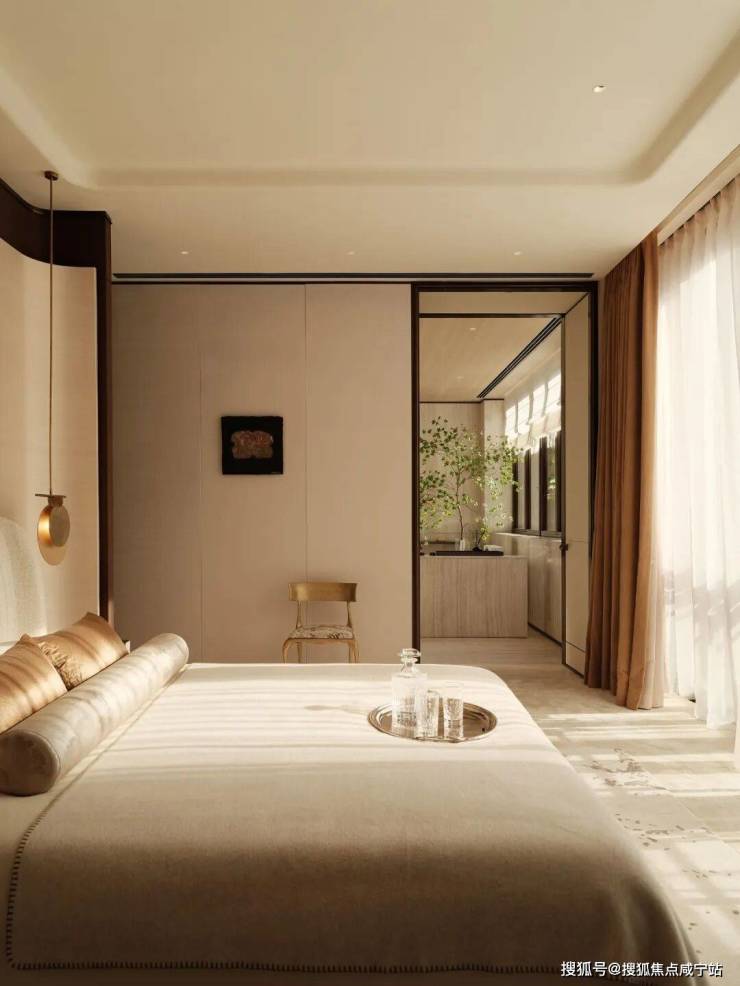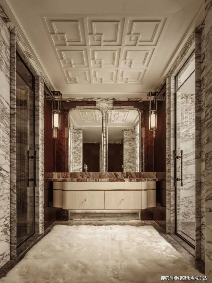 餐厅与水景庭院隔窗相望,羊皮纸拼就而成的屏风成为视觉焦点,内凹式金色圆顶,既赋予空间安定感,又营造出轻盈视效。在这样一座联结历史与当代的精神居所中,追溯东方视角,将上海百年风华凝练于启程转合之间,也昭示着生活的无限可能。