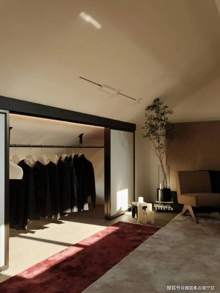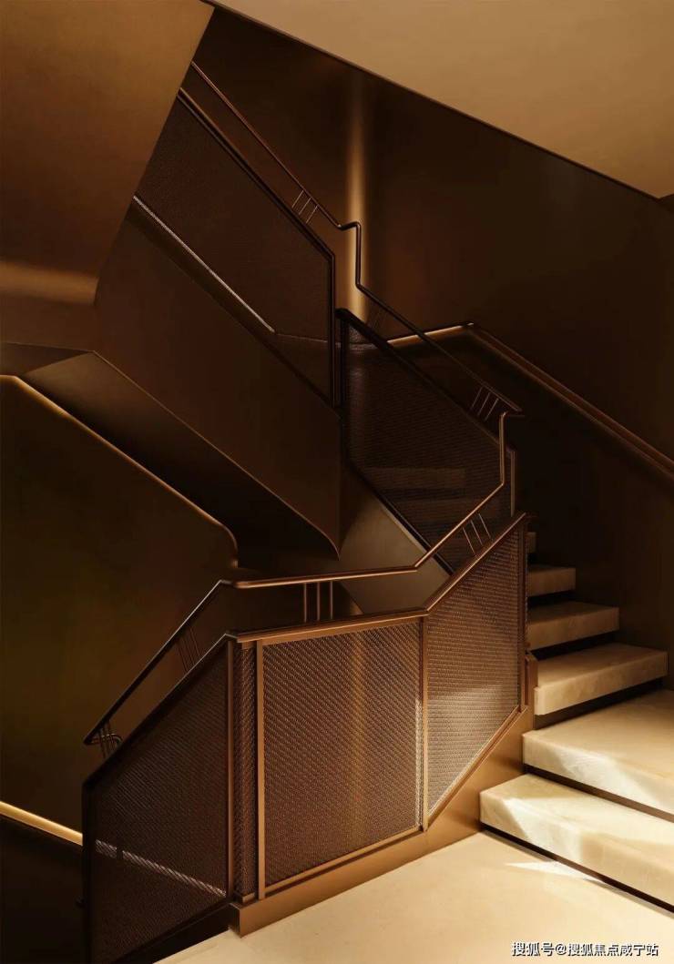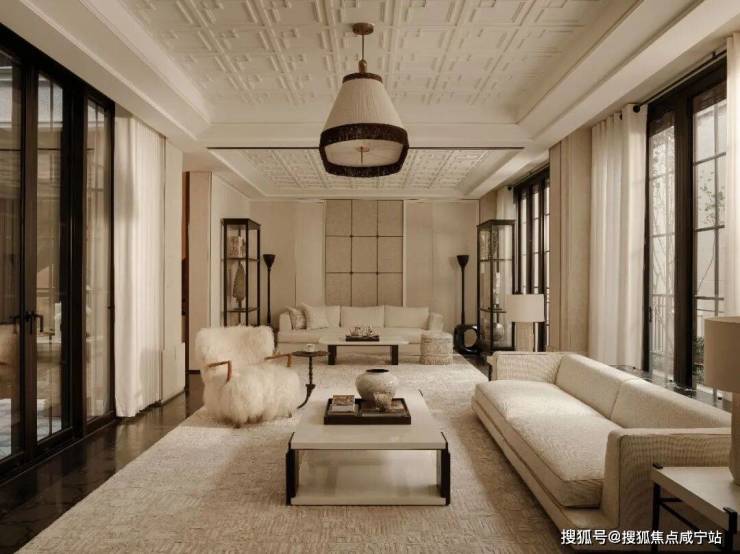 进入米金色的正厅,四组定制款落地玉石灯具围合出一方天地,也将前后庭院的景致框成家中逸动画作,润泽质地为场域注入东方底蕴。柔灰的大理石地面,流畅的吊顶流线,与硬挺的金属构件形成刚柔对话。