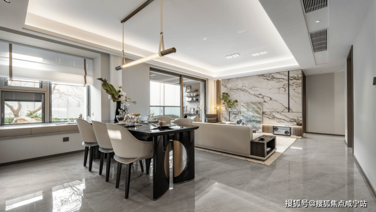 客餐厅阳台一体设计,客厅南连宽景阳台,餐厅南连飘窗,南北通透采光,将生活的奢度打开。