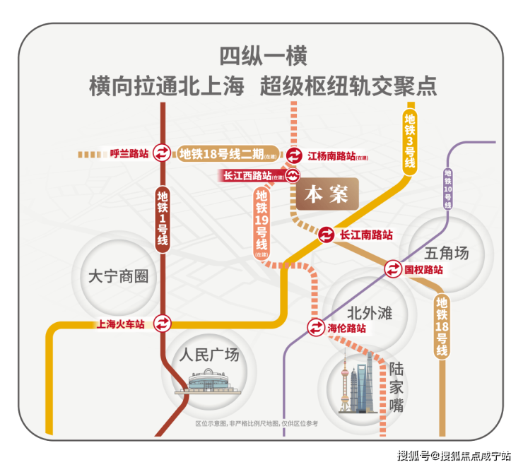 北上海轨交聚点 • 中环之上奢居新地标:地铁18号线横向拉通了原本纵向不相连的四线地铁:1/3/18/19,将北上海横向联通,成为区域轨交的交汇聚点;项目紧邻长江西路地铁站(直线距离约150米),1站江杨南路,5站复旦,7站五角场。