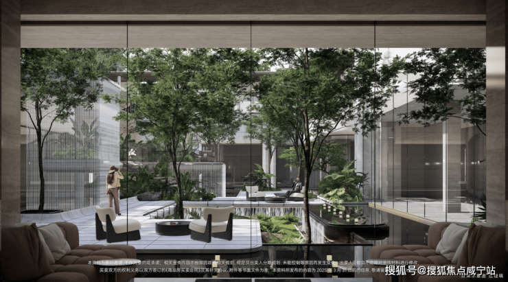 下沉式庭院,通过垂直景墙、悬浮观景台与叠水景观的立体交织,实现移步换景的视觉效果,也与会所空间形成无界交互。
