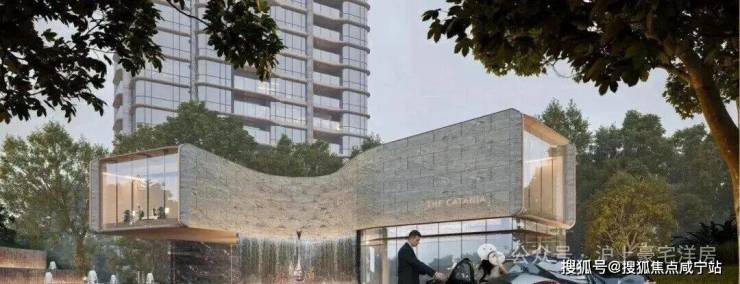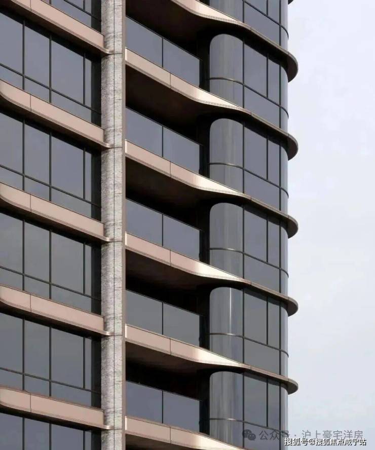 项目跳出常规住宅的方盒子形态,以"乐器王后"大提琴的优雅弧线为灵感,将曲面语言融入建筑立面。通过冷灰色石材、防铜色铝板、不锈钢和曲面玻璃的精心搭配,辅以国内住宅罕见的穿插镂空、楔形线角等细节工艺,让建筑立面呈现出疏密有致、生动错落的韵律感,宛如流动的音乐旋律。这种经典与现代交融的设计,不仅弱化了建筑的冰冷感,更极致地优化了室内视野——曲面屏幕墙和全景舱弧形飘窗的设计,让每一户都能拥有更广阔的观景视角,兼顾美学与居住品质的前瞻性思考。
