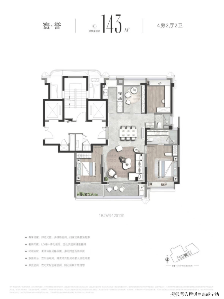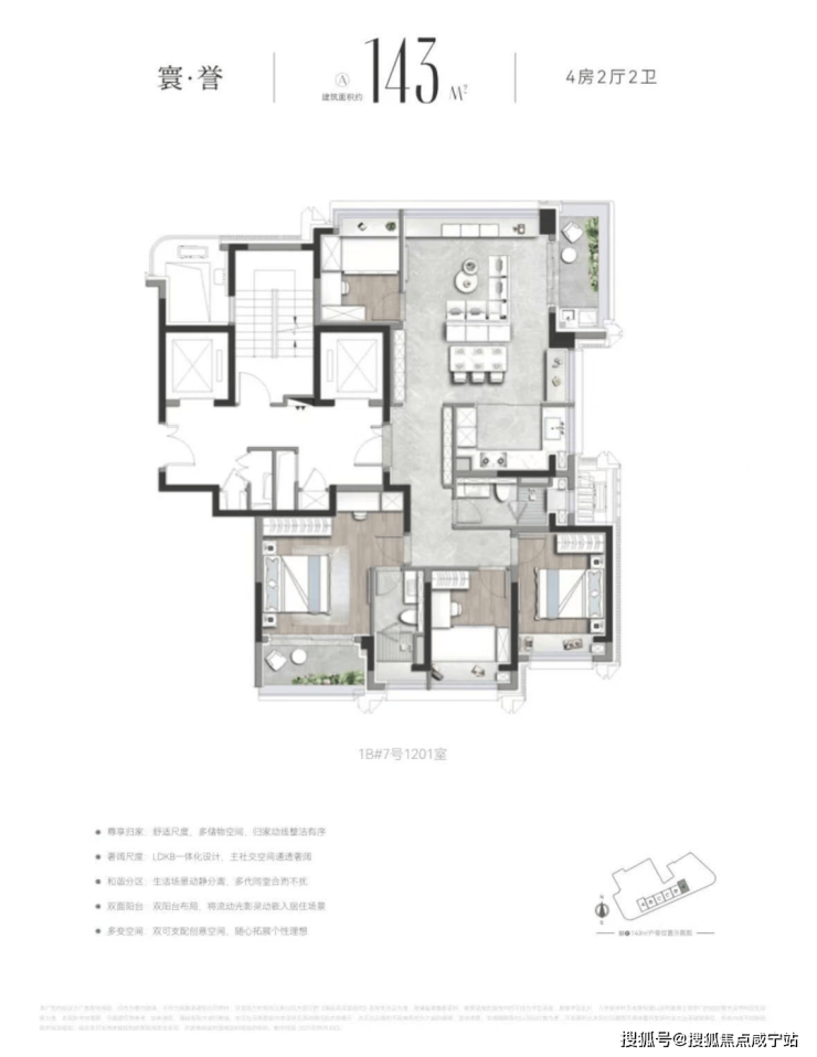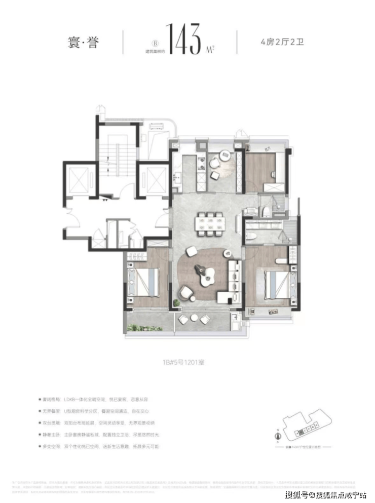 首开产品为143㎡左右4房,南北通透的飞机户型,三开间朝南,南向约 11 米面宽;类一梯一户,全明设计,无暗间,北侧无连廊;多飘窗,双阳台设计,高得房率,高使用率;