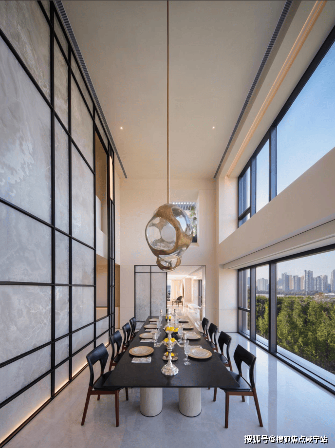 还有项目的外立面,采用了平整度、精度远超常规铝板的开放式铝板设计,外观美轮美奂,同时配以大面积玻璃,让壮阔的城市景和园林景,毫无保留地“冲进”室内