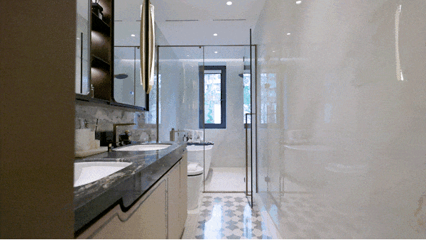 南向双主套均配备独立卫浴与全景飘窗,主卧卫浴更是采用“双台盆+浴缸+淋浴区”的三段式布局,媲美五星级酒店!