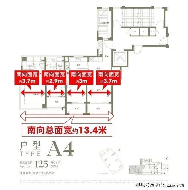 约13.4米四开间朝南面宽!同面积段新规产品普遍只有11米!多出来的2.4米,意味着更多的阳光、更长的日照、更爽的视野!