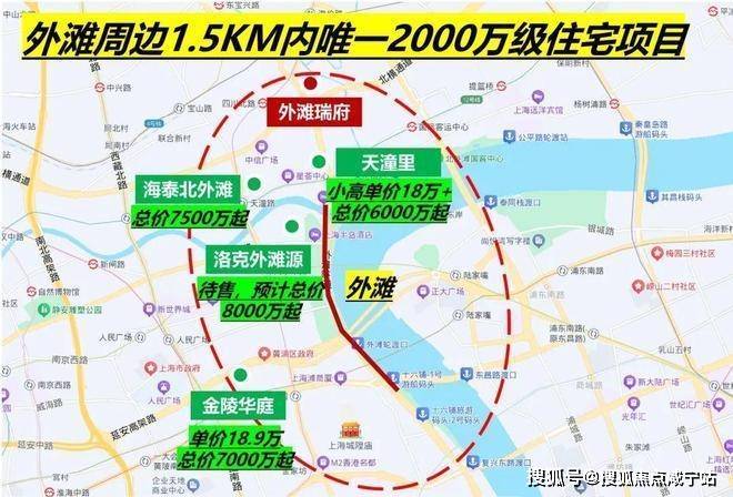 比如金陵华庭,步行到外滩约1公里,和「外滩瑞府」到外白渡桥距离相近,单价直奔19万元/㎡。