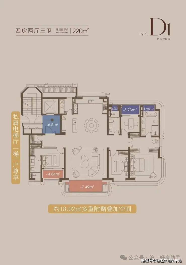 作为楼王中的顶豪户型,该户型有诸多亮点: