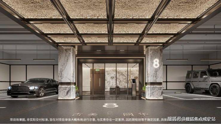 奢雅艺术地库空间,古铜色金属与水波纹工艺搭配,构筑璀璨星空穹顶,当驱车回家时,缓慢的车速间,周围空间将呈现出一种流动的光感艺术,极具视觉冲击,营造低调奢华的气质及强烈的尊崇感。