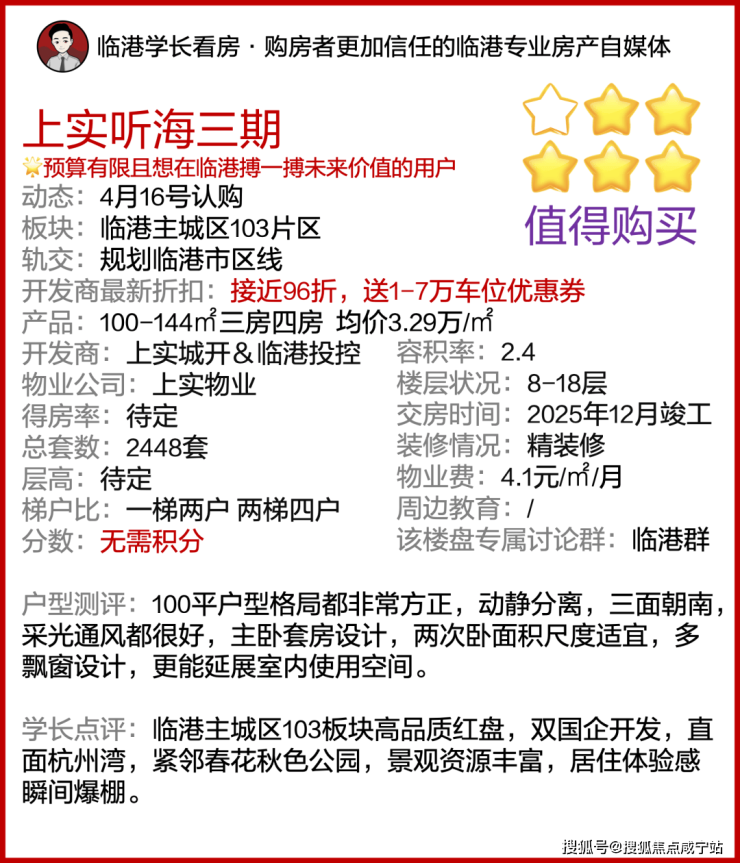 最新消息,一房一价表发布!临港主城区103片区「上实听海」三期明天认购!推出建面约100-140㎡三房四房,均价约3.3万/㎡!