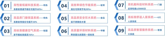 有着高性能低碳科技系统、高品质安全饮水系统、高品质智慧服务系统等“玖”维高能系统。以能耗水平远低于常规建筑物的建造标准,让房子能耗更低、碳排更少、居住体验感更佳。