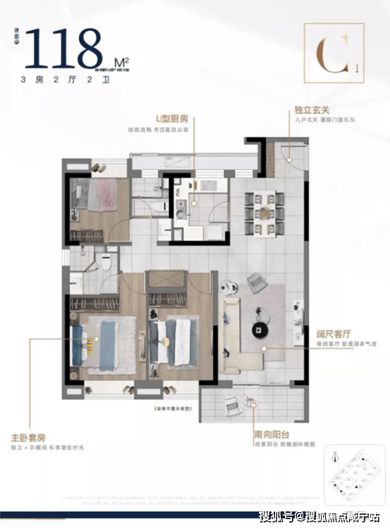建面约118㎡3房2厅2卫,入户独立玄关,收纳功能更强。U型厨房,动线流畅。格局南北通透,三开间朝南,餐客厅一体,链接南向阳台,拥有更好的采光、通风。动静分离,全卧飘窗,主卧独卫+衣帽间设计,舒适感不言而喻。