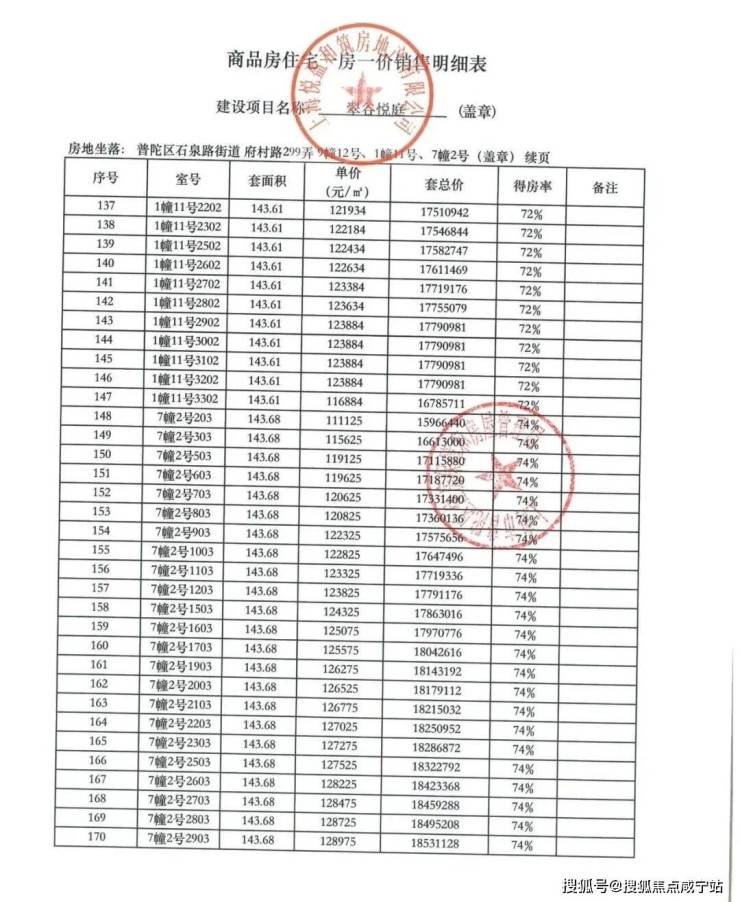 一房一价表已经公示: