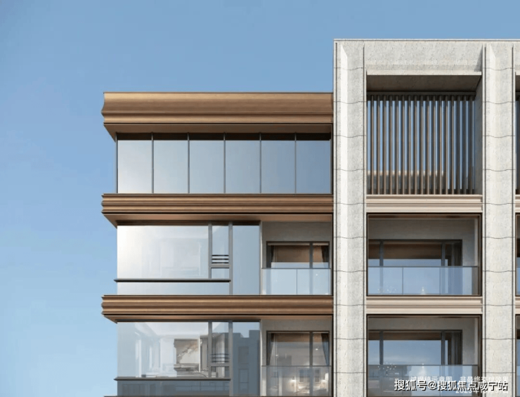 质感立面:采用石材+铝板组合,可视面均为古铜色金属铝板、米黄色铝板/石材,搭配边套270°大转角飘窗,从正面、侧面到背面,立面精致统一,颜值与质感双在线。