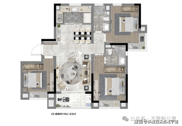 C2户型、建面约110㎡,三房二厅二卫