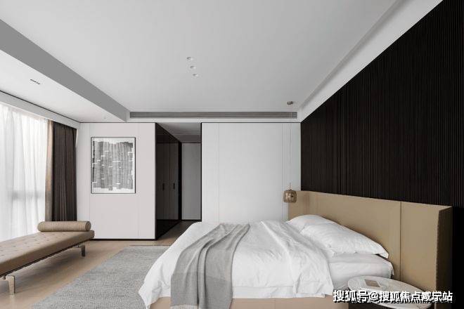 私密场域依旧保持静谧,黑白色基础上搭配了更多的色彩,例如深棕、浅紫等,艺术品的衬托深邃迷人,热络了家的氛围。