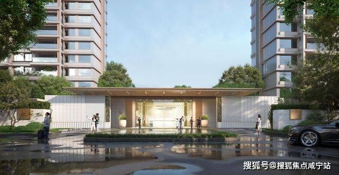 北入口社区大堂、下沉会所、下沉庭院与部分楼首层架空设计联合打造社区共享客厅,以折型风雨廊围合庭院空间,让业主的归家仪式感焕然一新。
