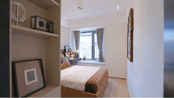 主卧套房设计,边套户型更独享270°超大转角飘窗,将广阔视野与充沛采光一并纳入怀中,无论昼夜晴雨,窗前皆是无遮挡的风景画。地面铺设柳叶拼实木复合地板,温润而富弹性,光脚踩踏也倍感舒适。