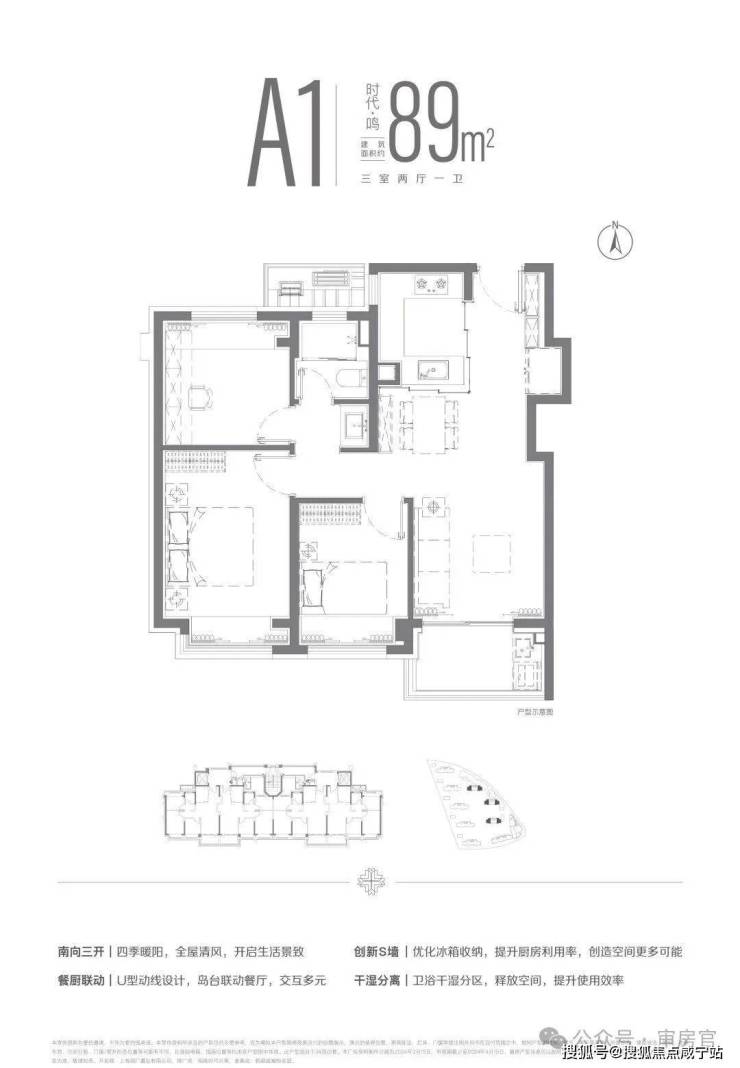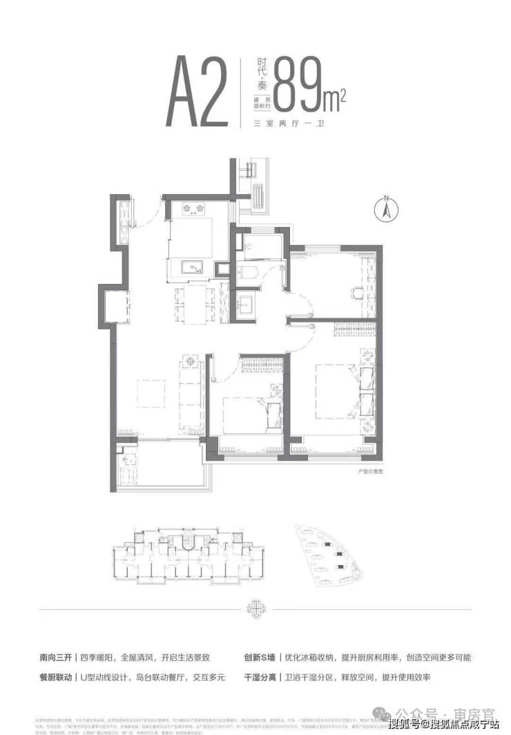 建面约89m²三房两厅一卫户型,LDKB一体化设计,南向三开间布局,全明空间设计。让四季流转于生活之中,用自然营造生活的惬意。