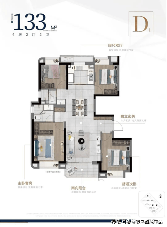 建面约133㎡4房2厅2卫,四叶草户型,面积不浪费,而且保障了私密空间。入户独立玄关,具有更强的收纳功能。餐客厅大开间,满足空间感的基础上,增加了户型的功能性,生活舒适度提升。全卧飘窗,主卧套房设计。U型厨房,动线流畅。