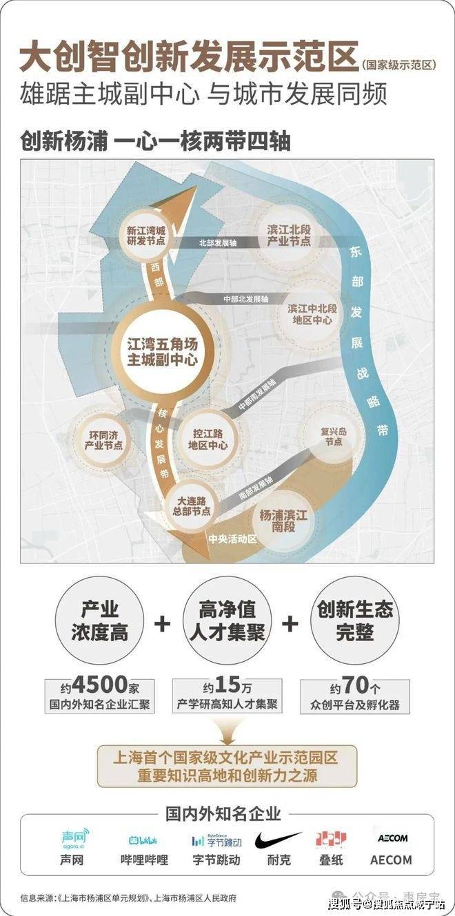 江湾五角场和新江湾城共同构建了大创智创新发展示范区。形成了世界级的产业集群,是 “产业浓度、人才浓度、创新生态” 兼具的创新功能聚集区。