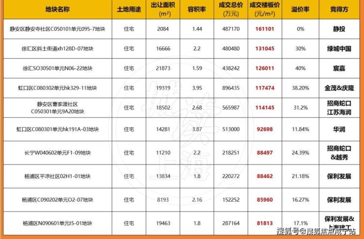 近期土拍高溢价地块,根据上海土地市场公开数据整理