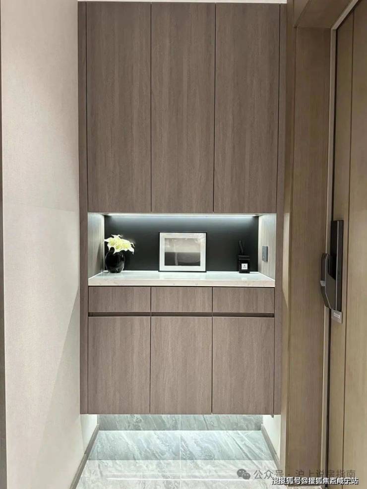 入户玄关更是设计了大量的收纳空间。底部架空,可以用来摆放鞋子,并设置有嵌入式灯带,整体的氛围感拉满。