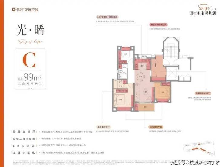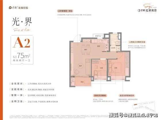 户型设计上,保利虹桥和颂,品质改善为出发点,设计“私属、至臻、尊崇”三大产品理念,臻奢建面约75㎡户型,三开间朝南,阳光与清风为伴,玄关+餐边柜+飘窗,全能收纳,卫浴三分离,干湿有别,奢阔餐客厅一体,空间明朗,动线流畅。