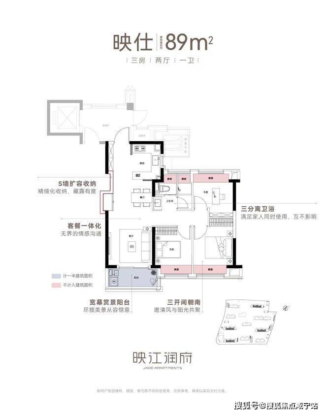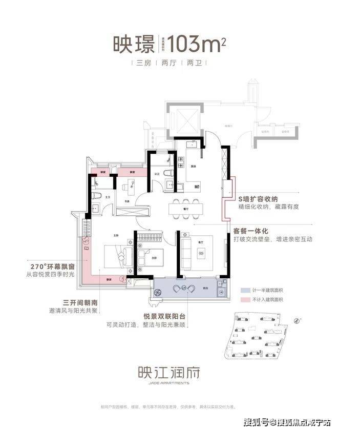 亮点五:双联阳台+多飘窗赠送、灵动空间。映江润府103户型,实现了100平级别难得的双联阳台,实现了室内空间的横向延伸,同时,搭配主卧、主卫、书房的“全飘窗”设计,赋予了空间更多灵动的使用场景。