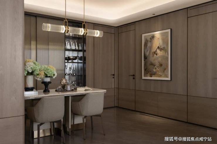 客餐厅采用到暖色系木饰面,和大理石地板、金属踢脚线相得益彰,透露精致与隐奢。