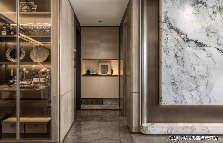 入户玄关,采用皇家白玉的台面,玄关柜门体采用皮革包裹,高定仪式感扑面而来。