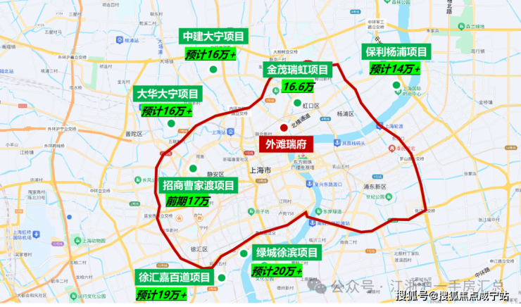 今年六批次土拍,绿城竞得北外滩新宅地,溢价率超过46%,未来售价预计突破20万元,它的位置就在「外滩瑞府」东侧约1KM。