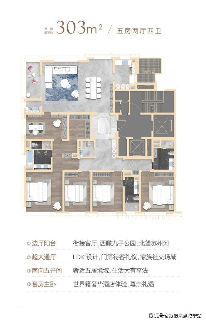 顶豪社交空间格局,普遍只有餐厅、客厅和阳台,该户型在南侧配置了一个家庭厅着实巧妙,可以是业主的茶室,也可以是女主人的手工室,当然也可作为X空间,随家庭结构和需求随心定制,书房、学习区、游戏区,女王化妆间等皆可。