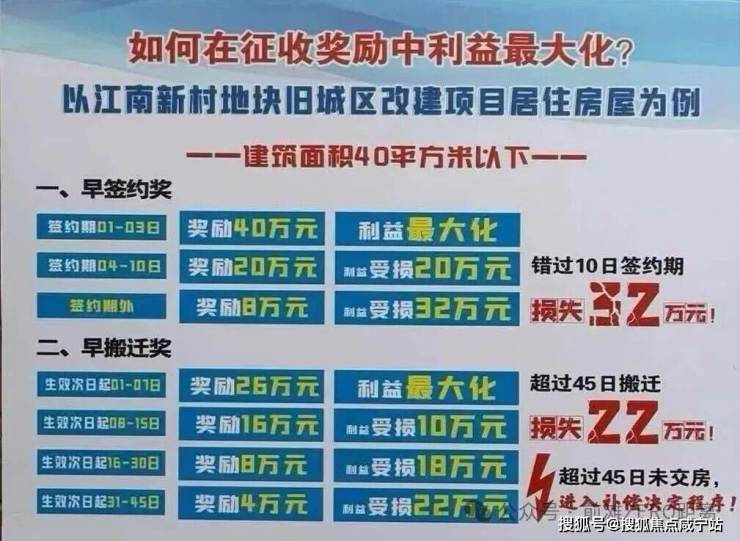 以江南新村40㎡的房屋为例:居民叠加早签约奖(1-3日内签约保底奖励40万元),早搬迁奖(1-15日内搬离奖励4000元/㎡,保底16万元),首批搬迁奖(10万元),新增房票奖励8万元等其他奖励,如果再叠加成套价格补贴(60万元/证),总奖励+补贴金额可轻松超过100万元。据估计,部分补偿单价有望突破15万元/㎡。