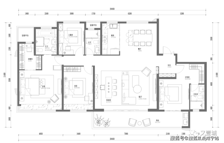 这是非常标准的“大面宽短进深”的黄金户型格局,东西面宽约20.45米,南向宽阔4+1开间。
