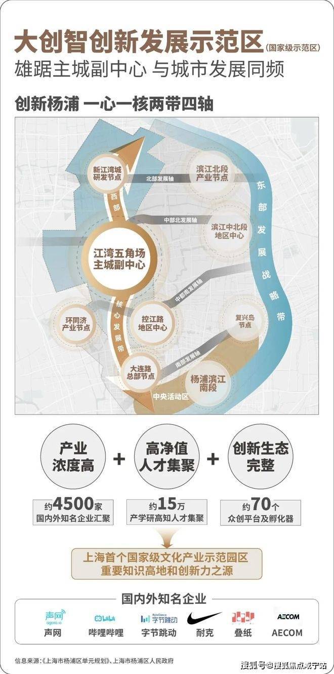 江湾五角场和新江湾城共同构建了大创智创新发展示范区。形成了世界级的产业集群,是“产业浓度、人才浓度、创新生态”兼具的创新功能聚集区。